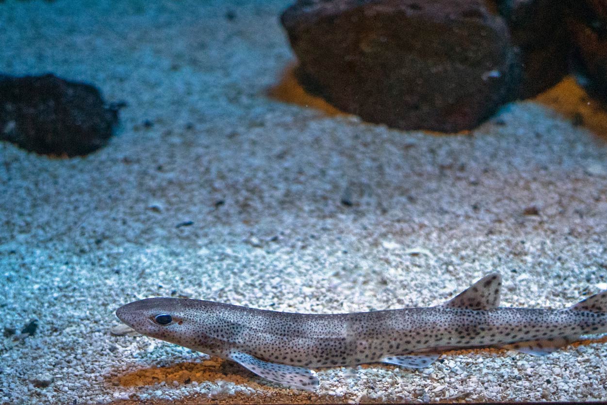 A small, slender-bodied shark, the lesser spotted dogfish is brownish-grey in colour with darker spots across its back and flanks. It has rough, sandpaper-like skin, large eyes, and two small dorsal fins set far back on the body. Typically reaching 60–80cm in length, its firm flesh is encased in a tough, leathery skin that can be difficult to remove.