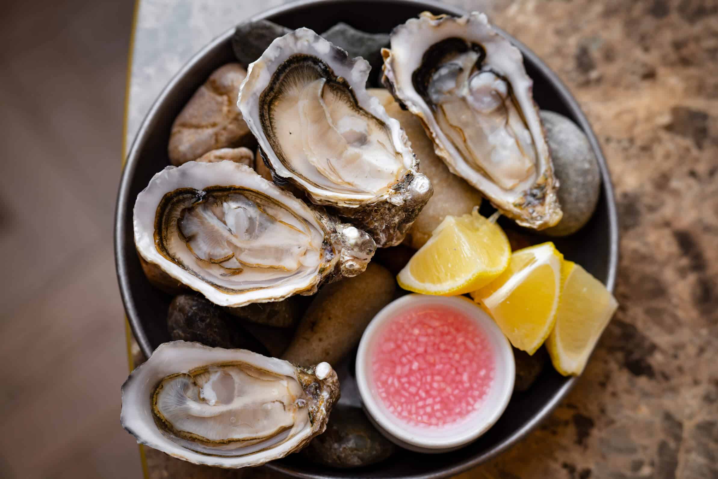Classic ‘naked oysters’ served with shallot vinegar and lemon